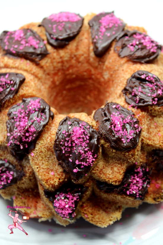 7. Pour ½ of the batter into a well-greased and panko breadcrumb covered bundt pan. Drizzle in chocolate syrup. Cover with the remaining batter and swirl in more chocolate syrup.