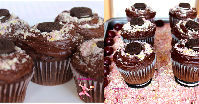 Allow the baked goods to cool before frosting. Hershey’s Chocolate Frosting adorns my cupcakes. The cake is slathered with my Morello Cherry Buttercream and garnished with strawberry Pocky which was crumbled in the food processor. Morello cherries also decorate the cake. Strawberry Pocky crumbles were sprinkled on the cupcakes and given a mini Oreo center.