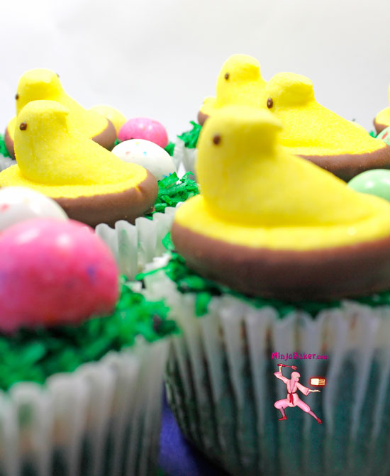 9. Sprinkle the green coconut grass onto the cupcakes. Top with a marshmallow bird and chocolate eggs.