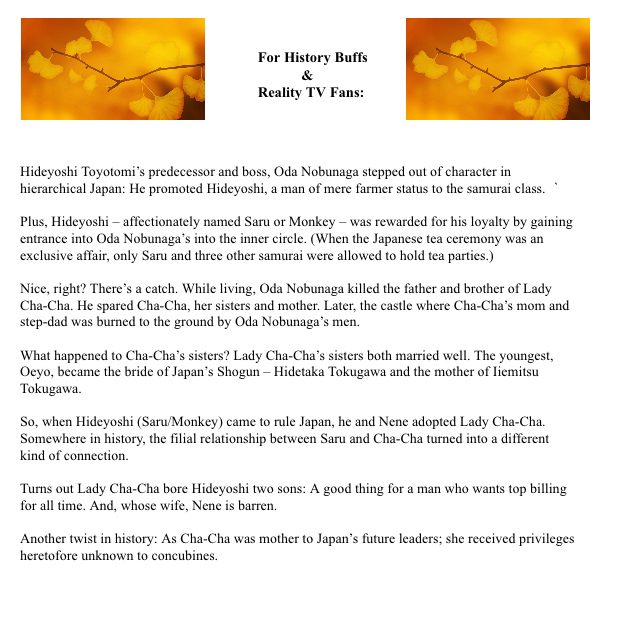 The adopted daughter of Nene and concubine to Hideyoshi got to keep the mighty Osaka Castle. (Her nickname was Lady Cha-Cha. Think tea, not the dance.) So as not to be outdone, Nene pulled out every designer’s trick in the book to make her new residence the best. (Scroll down if you are a history buff or Reality TV fan.)