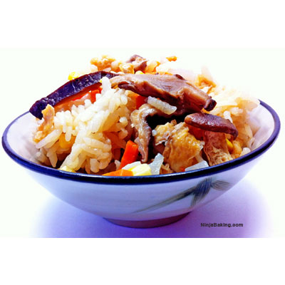 Into a rice cooker, place the 4 cups of rice plus the water, liquid drained from the mushrooms, sugar, hondashi, soy sauce, sake wine, tea and the stir-fried ingredients. Cook according to manufacturer’s directions. (50 minutes in the Ninja Baker’s rice cooker.) If you don’t have a rice cooker, this recipe should work well with rice made on a stovetop.