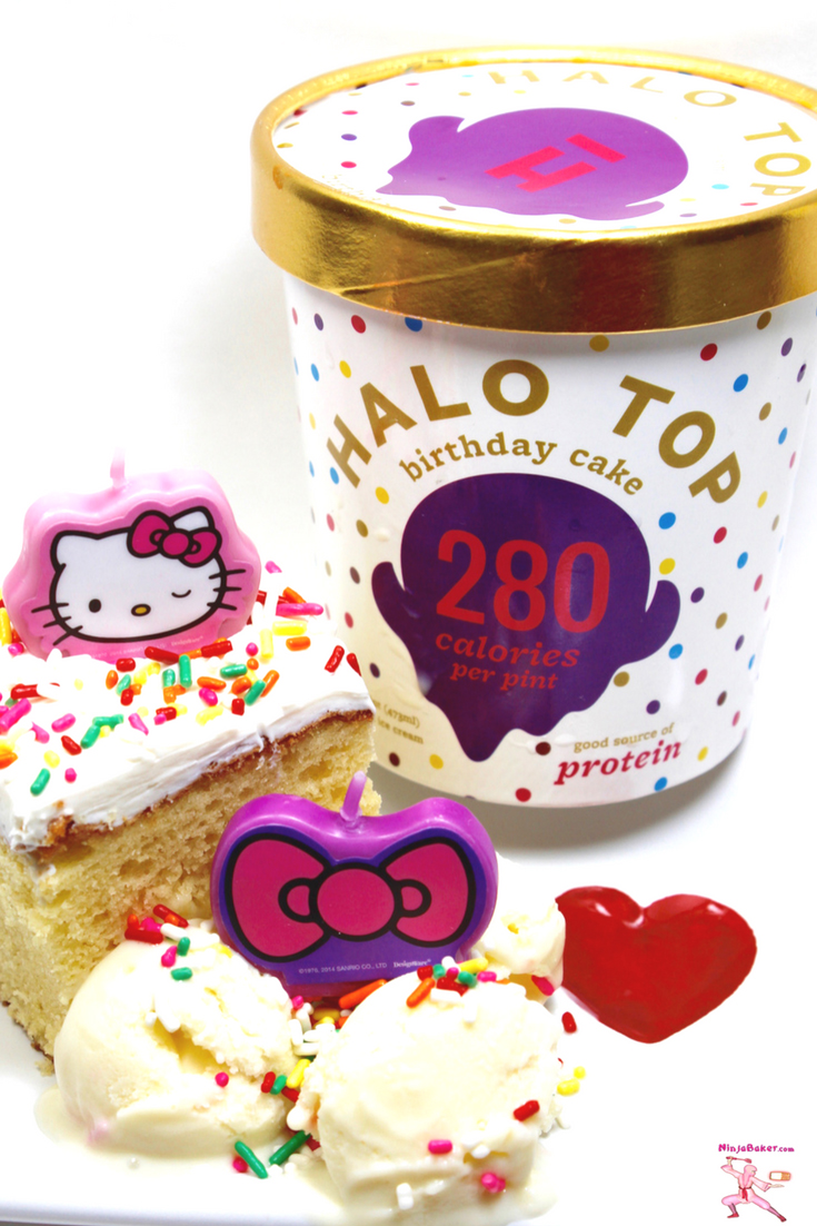 Also, melted Halo Top Birthday Cake Ice Cream is perfect for Hello Kitty birthday cake. One pint of Halo Top ice cream, melted plus ¼ cup of whole fat milk produces a light, luscious vanilla cake. Topped with vanilla frosting, colorful sprinkles and Hello Kitty accouterment, birthday cake is a cheery way to celebrate today!
