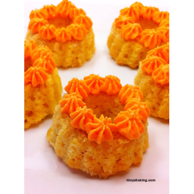The Ninja Baker's Hong Kong Chiffon Mini Bundts contain a bit more sugar and are topped with Triple Sec liqueur buttercream flowers. Thanks to the generous zest of fresh orange, the cake is still quite tart. Combined with the sweet frosting the mini Bundt is a kiss of bliss!