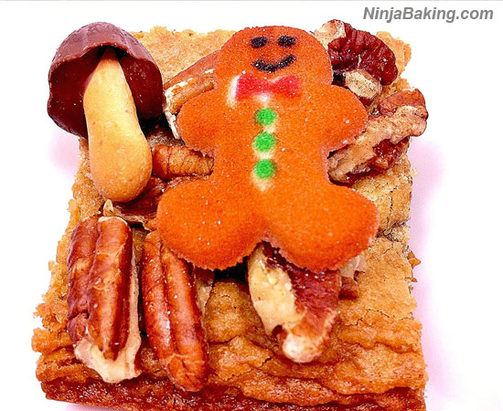 Bake for 35 minutes or until a toothpick inserted in the center has only a very few clinging crumbs. Garnish with pecans and if desired, gingerbread sugar boys and chocolate biscuit cookie bits.