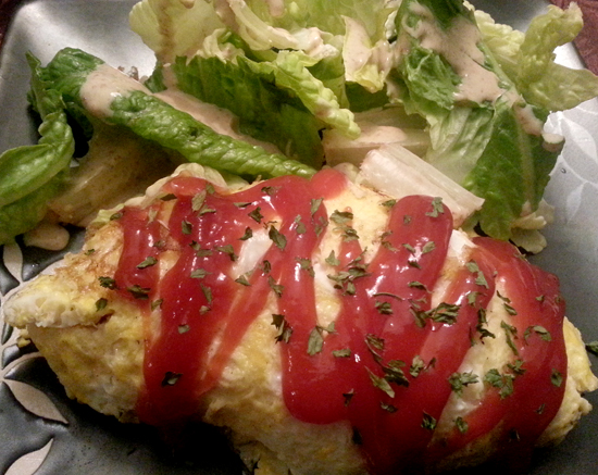 For the omelet, coat a clean pan with olive oil. Swirl in a thin layer of the egg mixture. Keep swirling the eggs over the surface of the pan. When slightly set, scoop the rice mixture into the middle of the eggs. Flip the sides of the egg over the rice. Gently slide the omelet onto the plate so the bottom of the pan is now on top.