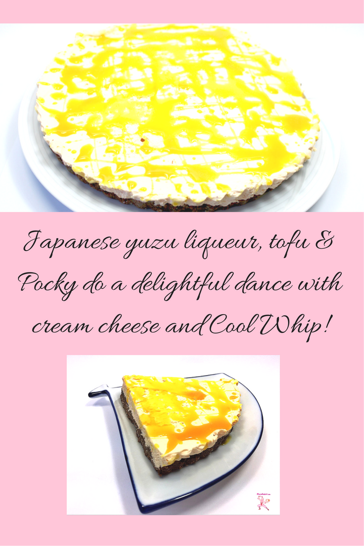 The best of both worlds collide in this luscious Japanese yuzu liqueur laced cheesecake! Cool Whip, cream cheese, tofu and yuzu liqueur go for a twirl in the food processor with a few more ingredients. Then poured into a Pocky crust.