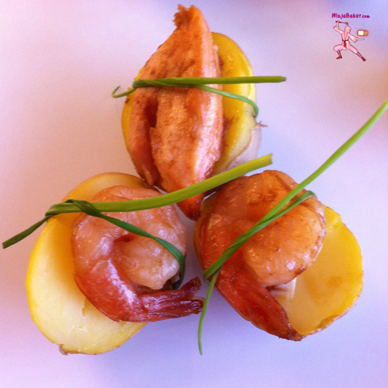 Slice the Yukon Golds in half. Place a slice of salmon or shrimp atop each half. Gently tie each Idaho® Potato Sushi with a chive leaf.