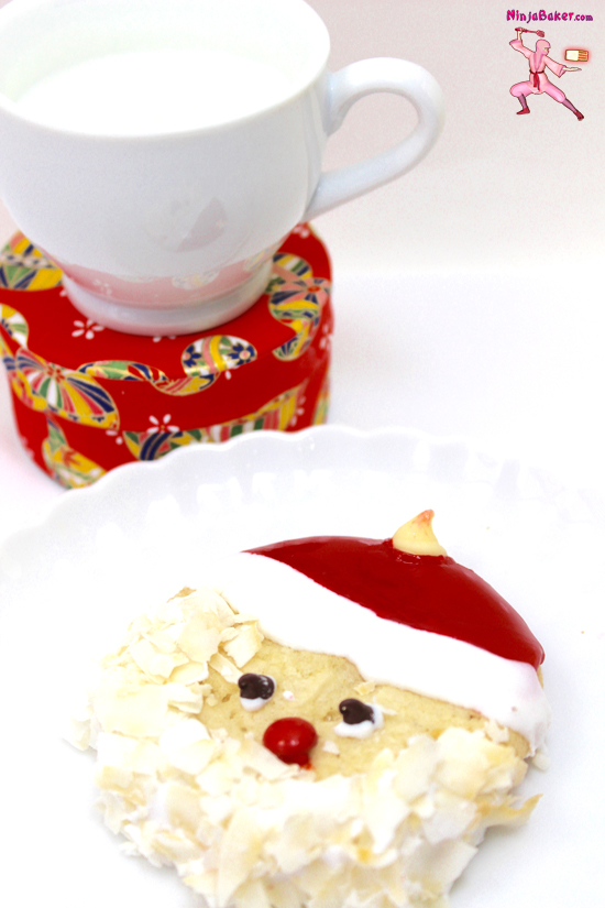 With the red cookie icing create Santa’s cap on the top half of the cookie. Trim with white cookie icing. Drop a white chocolate chip at the top of Santa’s cap. With the white icing glue on the mini chips and M & Ms for the eyes and red nose. Also with the white icing create Santa's coconut beard.