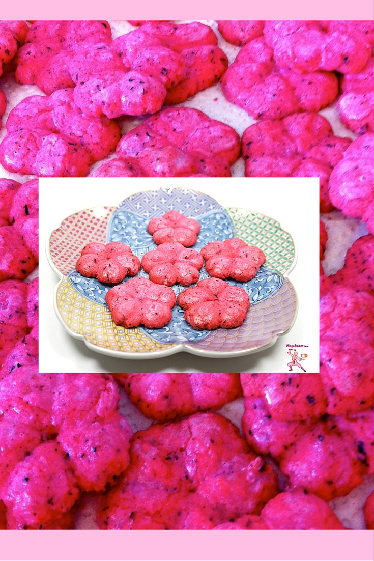 4. Cherry Blossom Bliss…Of course, this Ninja Baker would be remiss if I didn’t pay tribute to the pretty pink buds bursting out all over Japan (Washington DC and California.) My cherry blossom cookies are a happy marriage of snips of spice swirled with sweet. Watch a Japanese newscast; you’ll get reports about crimes, politics, stocks…and a forecast of when and where cherry blossoms bloom.