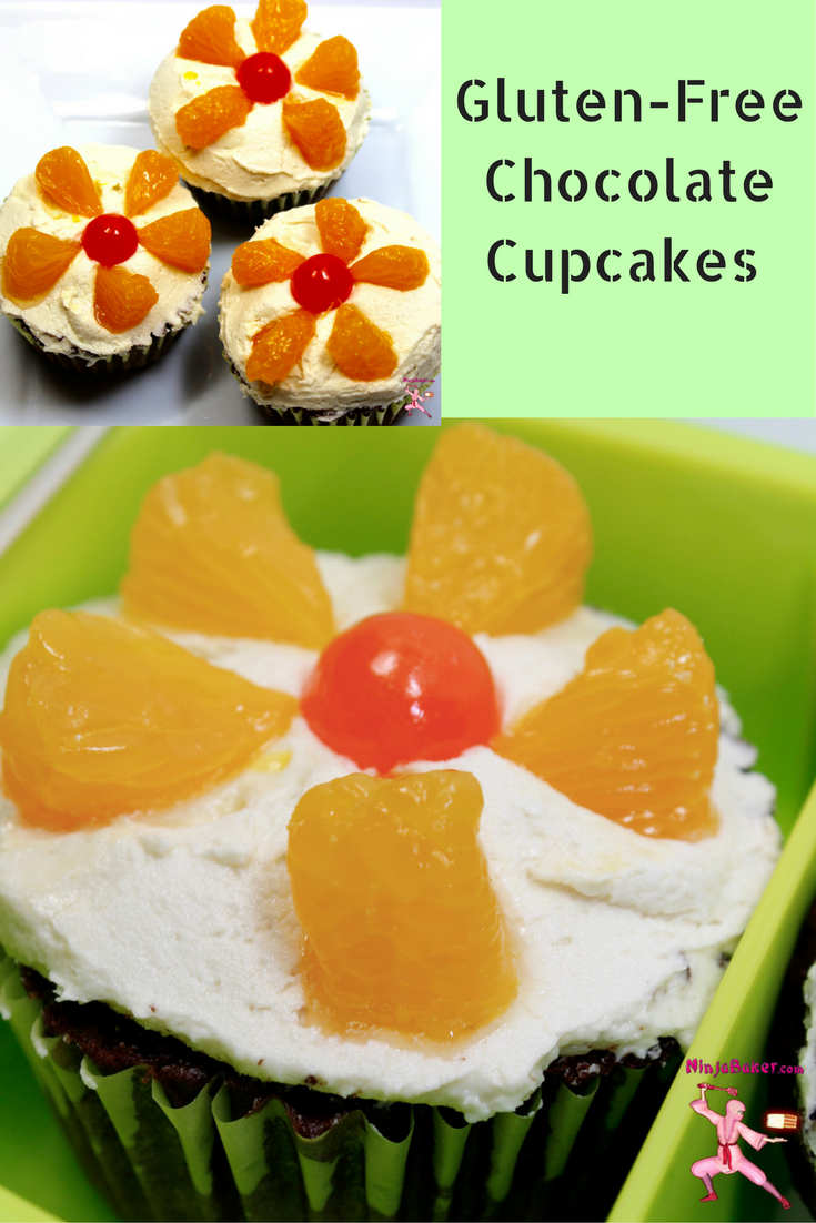 For reinforcement of high marks, here’s a very rewarding rich gluten-free chocolaty cupcake. Decorate as you wish. With Mandarin orange slices and orange gumdrops I created flowers. Love to see how you food-style your gluten-free bentos and cupcakes.