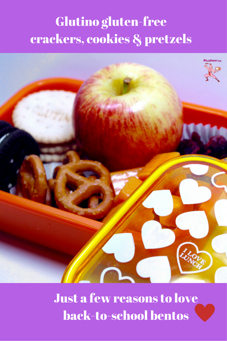 Fast forward in time: Smart companies like Glutino who are sensitive to the needs (and taste buds) of gluten intolerant kids started manufacturing gluten-free goodies. Today, Moms and Great-Aunties (like yours truly) can create super yummy gluten-free bento box lunches for school and work. I’m lucky there were enough pretzels and cookies for my photo shoot. My husband’s go-to snack is a bowl of Glutino pretzels and a bowl of mustard. A serving of Glutino Chocolate Crème Cookies follows the savory gluten-free goodies. (One bite and you may never touch another Oreo again. They are that good!
