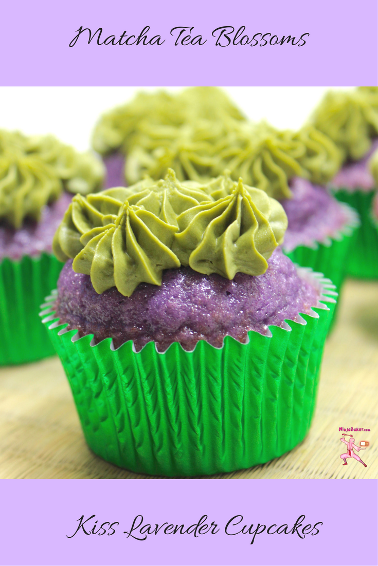 In Japanese cuisine, the look of a dish or dessert is tantamount to taste. The lavender hued cupcakes are indeed a lovely sight. The perfume of the cupcake also informs the palate in a very pleasant way! Bold matcha frosting compliments the light lavender cake.