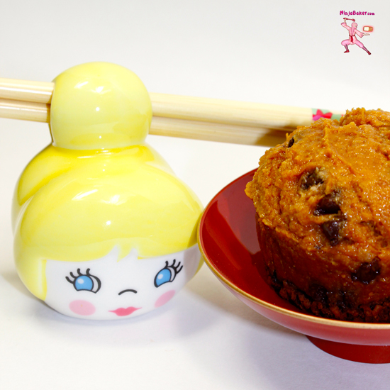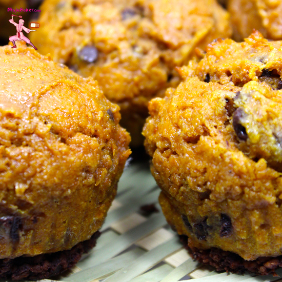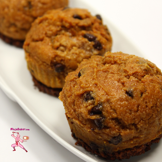 Pumpkin plays with chocolate miniature chips atop a chocolate Pocky crust. The muffin is soft, moist and a must-make for busy moms.
