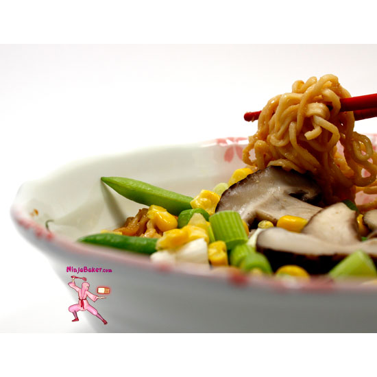 - Gently slide then ramen into a bowl. Garnish with the green beans, mushrooms, corn and scallions.