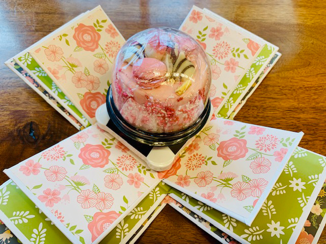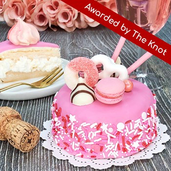 In Harry Potter Hogwarts style, the sides of the seemingly single-sided box turned into triple-tiered floral panels. A Pink Champagne Cake stood pristinely in the center. Peering through the mini cake dome, decorations of macaron cookies, chocolate kisses, and sprinkles came into view. Two tiny pretzel sticks also said hello. The cake was a petite and pretty birthday present for my "practically perfect in every way" friend. The same cake has also apparently been tagged as perfection by the bridal experts at The Knot.