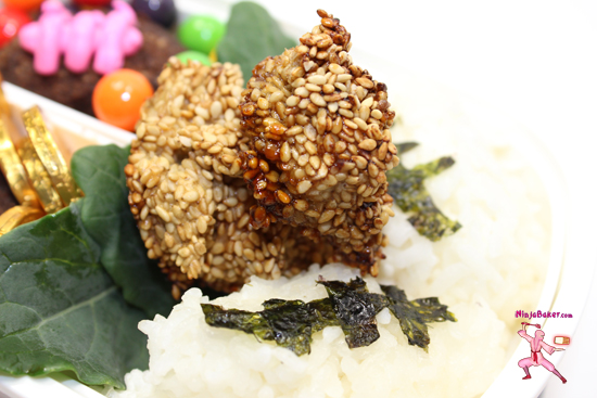 Japanese fried karaage chicken is a bento lunch box staple. For my health conscious husband, I created this baked sesame chicken. Same crunch factor. Plus, the bonus of an assertive sesame flavor paired with a tangy soy and honey sauce.