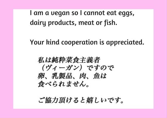 For the adventurous vegan,  print out the card below. Present the card to the server or restaurant owner and see what she or he points to on the menu. The good news is many family run restaurants offer menus with photos. Also, many Japanese mom-and-pop restaurants showcase plastic replicas of the food they serve outside the shop.