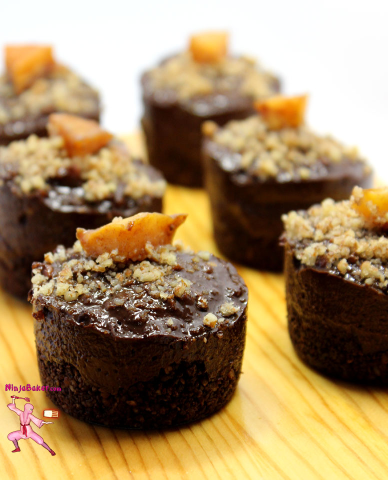 Vegan and gluten-free, these luscious chocolate cream cakes rival "regular" chocolate mousse. The crunchy nutty chocolate crust tops it off to make these minis a pièce de résistance. A sliver of Japanese persimmon bathed in a bit of coconut oil, cinnamon and organic brown sugar is a highly recommended garnish.