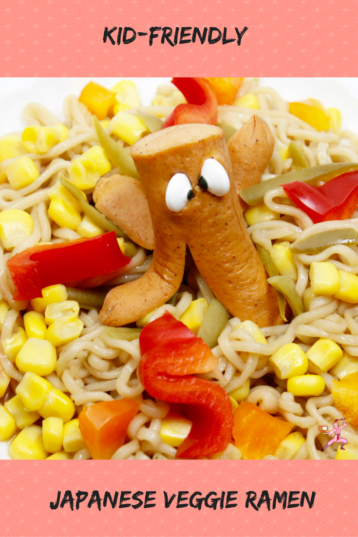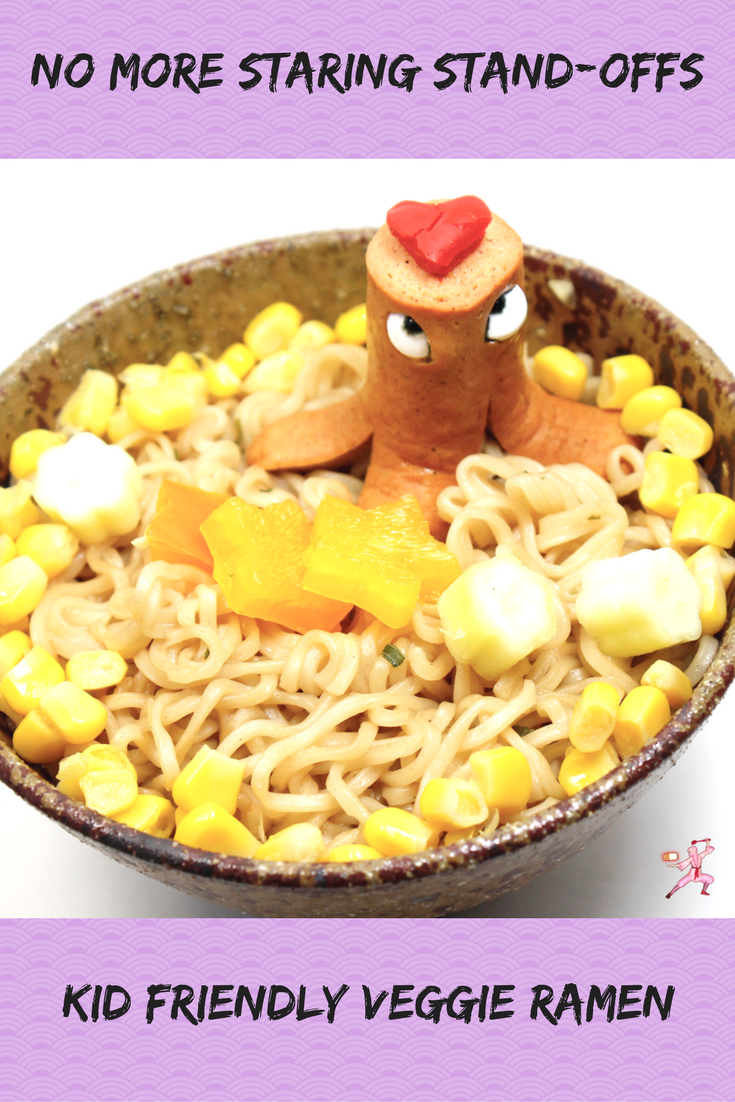 5. Garnish the ramen with the veggie shapes, corn niblets, green bean slivers and other oh-so-good-for-you vegetables.