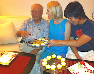If you are a purist, however, and can easily survive without buttercream decorations, Julia Child’s (Mastering the Art of French Cooking) orange cake recipe (adapted by the Ninja Baker into cupcakes) was a hit with my friends Masuno-san and Akio-san. The frosting (from allrecipes.com) and the cake both call for quite a bit of fresh orange. (I also topped off some of the cupcakes with chocolate frosting. I used the recipe off the Ghirardelli cocoa container.)